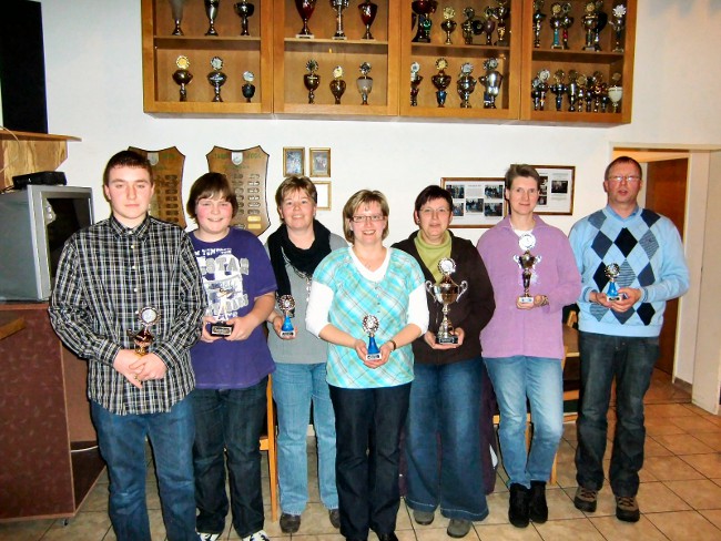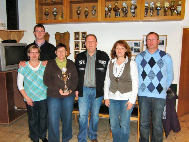 Anschließend der Bericht über die besten Platzierungen der Übungsabende 2010. 17 Schützen nahmen an mind. 20 von 42 Übungsabenden teil. Niklas Knese erhält für seine gute Beteiligung an 37 Abenden einen Pokal. Der Wanderpokal geht an Gaby Többen (vor Petra Josefus, Thomas Kater, Carsten Westermann und Reinhard Schulte).
