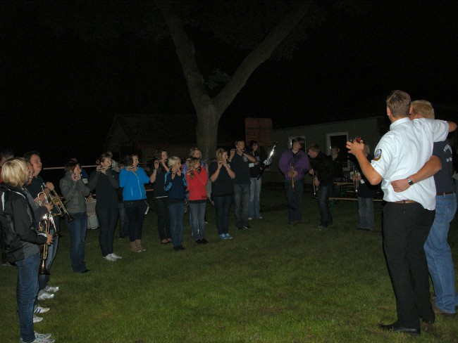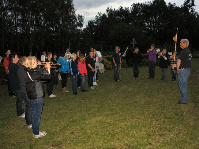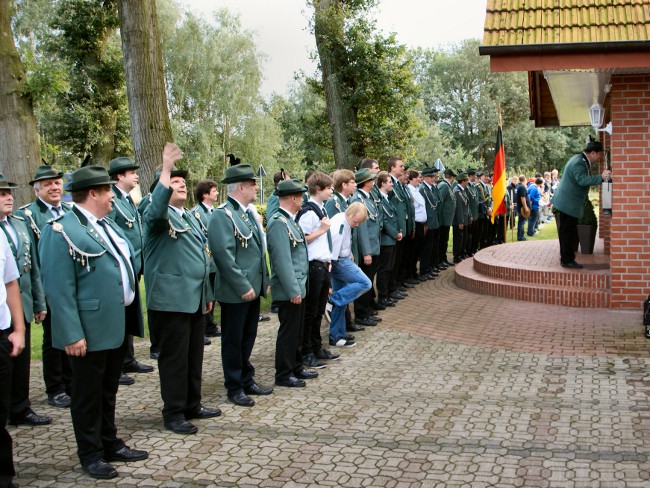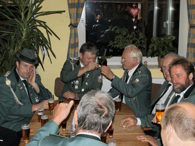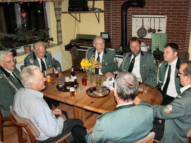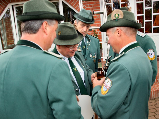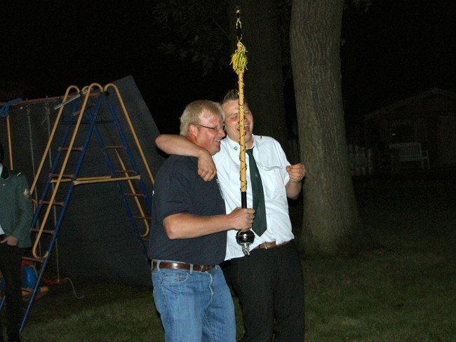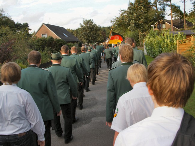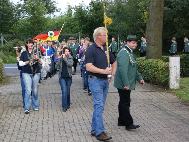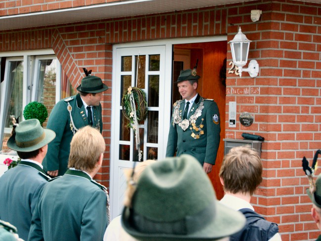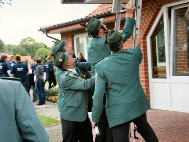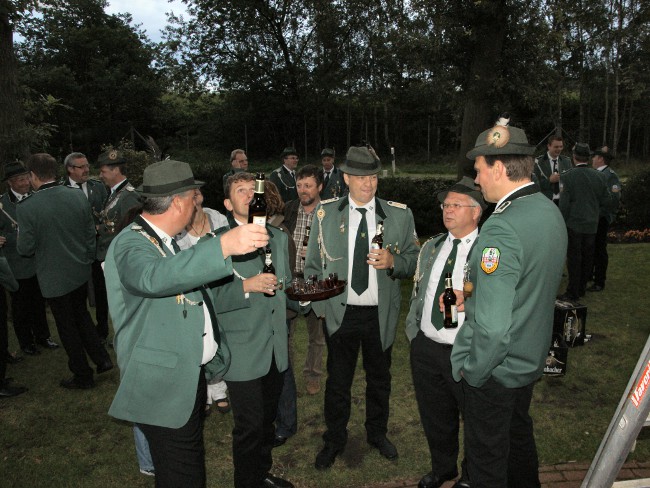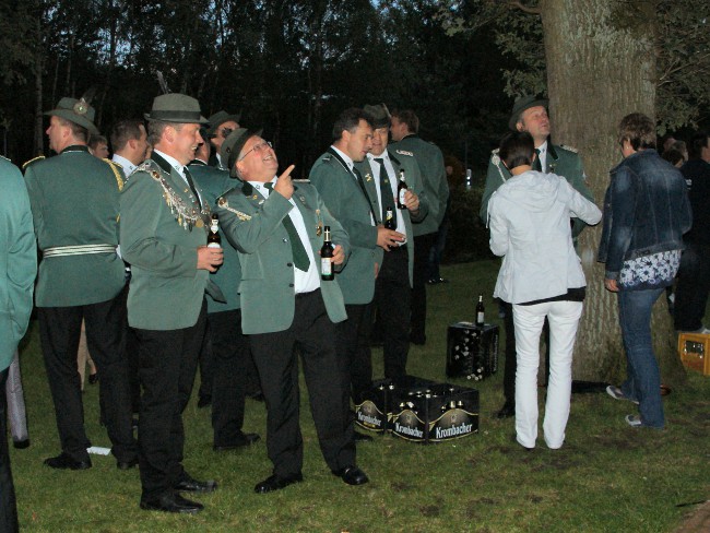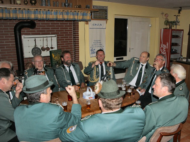 Der Weg zum Scheibe-aufhängen war in diesem Jahr etwas länger als sonnst, weil König Alfons II schon fast zum Meppener Feld gehört. Trotzdem marschierte eine starke Abordnung gut gelaunt zum König, um ihm die Königsscheibe zu überbringen. Musikalisch wurden die Schützenbrüder vom Spielmannszug Haselünne-West kräftig unterstützt. Wie auf den Bildern zu sehen, wurde bis tief in die Nacht gefeiert.