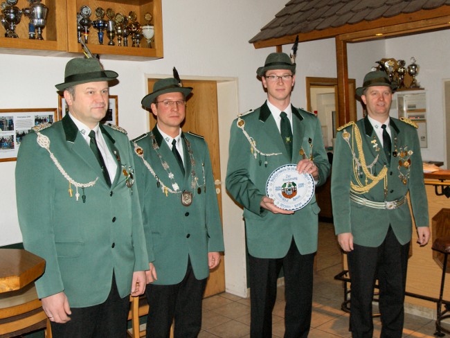 Andreas Schnieders (mit Teller) hat aus persönlichen Gründen auf der letzten Mitgliederversammlung seinen Posten als Kompanieführer zur Verfügung gestellt. Martin Mellentin betonte, dass er diese Verabschiedung bedauern würde. Er freue sich aber, dass Andreas Schnieders an anderer Stelle im Verein weiter mitarbeiten wird.