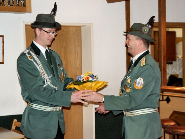 Hubert Kruse bedankte sich ebenfalls für seine langjährige Tätigkeit und wies auf die vielen, vielen Kilometer hin, die Hermann Schleper die Vereinsfahne getragen hätte. Martin Mellentin wechselte mit Hubert Kruse die Schulterstücke und überreichte Hermann Schleper einen Schmuckteller zur Erinnerung sowie einen Blumenstrauß für seine Ehefrau.