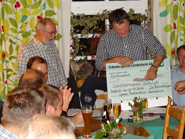 Günther Jansen (1. Fahnenträger) zeigt stolz den symbolischen Scheck.